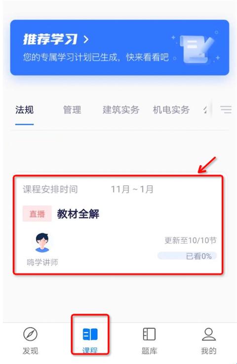1、打开嗨学课堂app,点击进入“课程”页面。根据您的学习需求,选择任一节您想要下载讲义的课程模块。