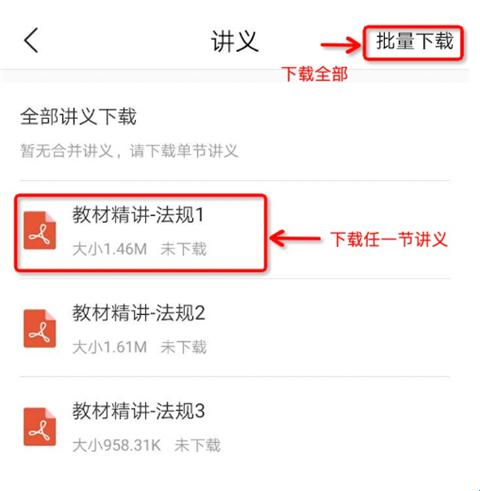 3、进入“讲义“页面后,您可以选择”批量下载“或任选一节课程的讲义下载。