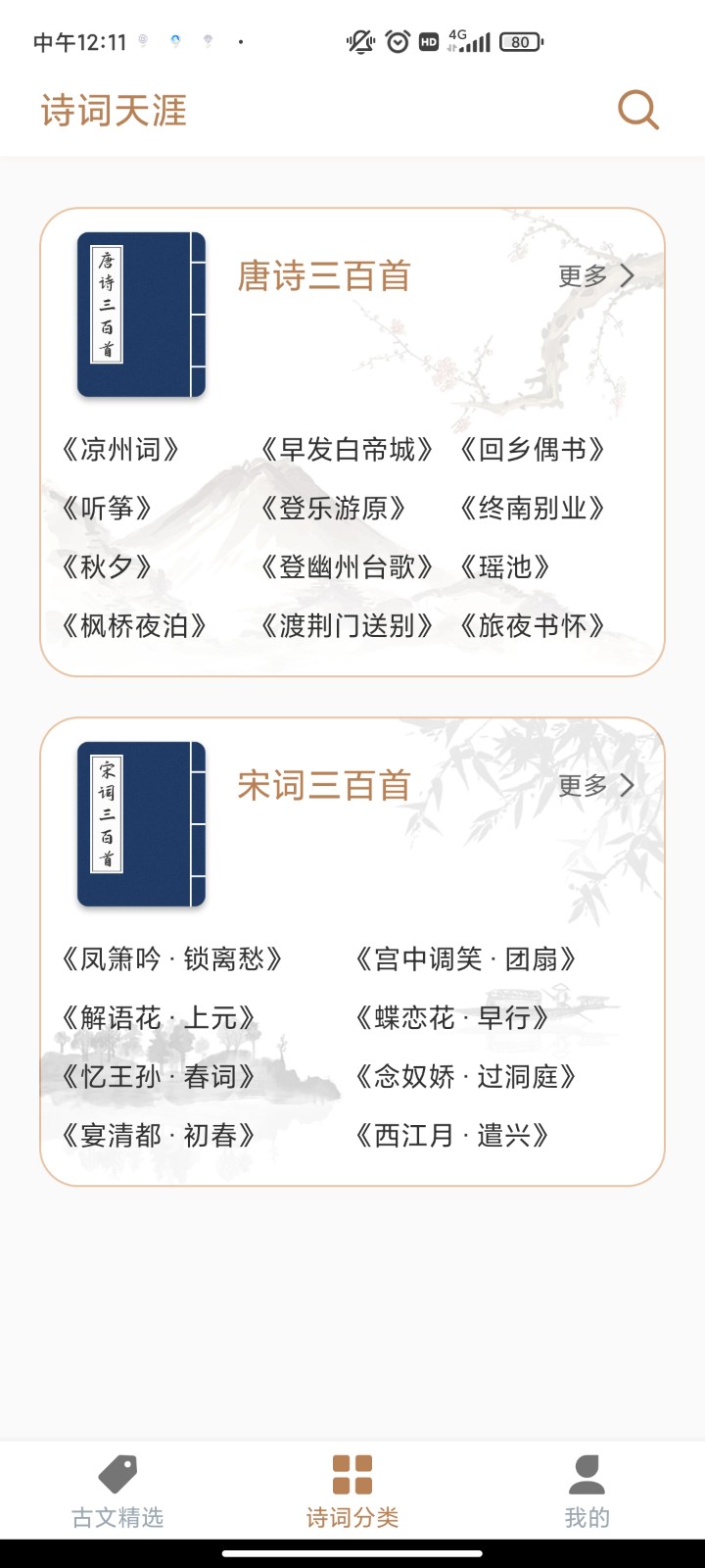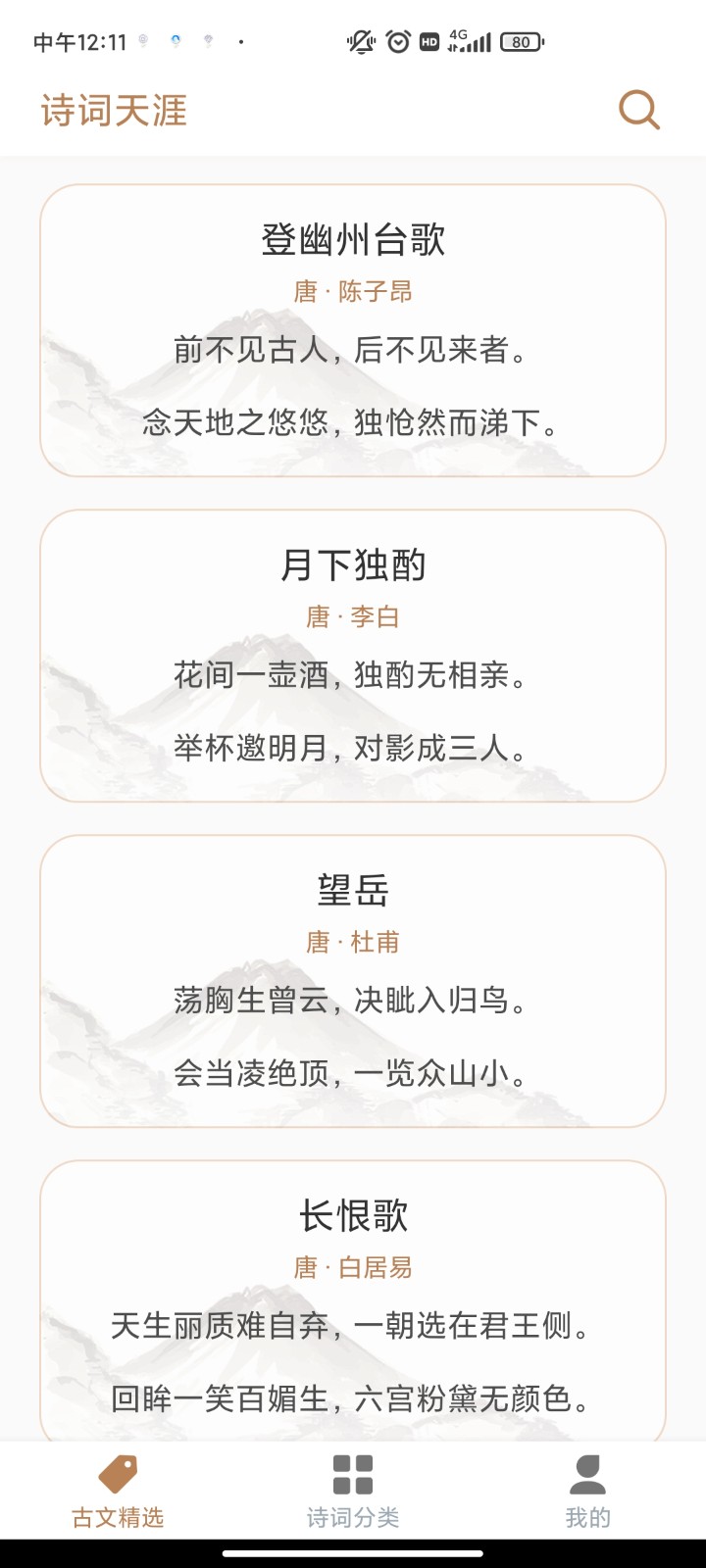 2、名句卡片:精选数千条诗词名句,卡片式切换