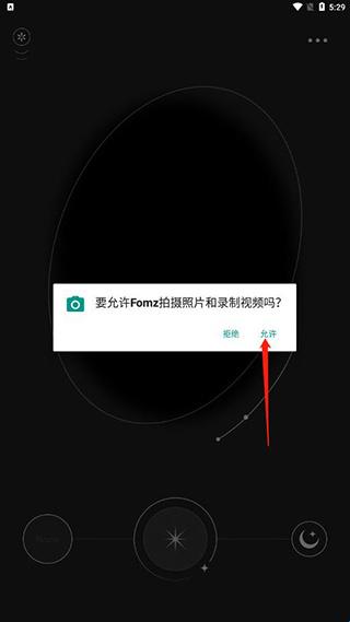 1、打开fomz软件,点击允许拍摄照片和录制视频开始拍摄;