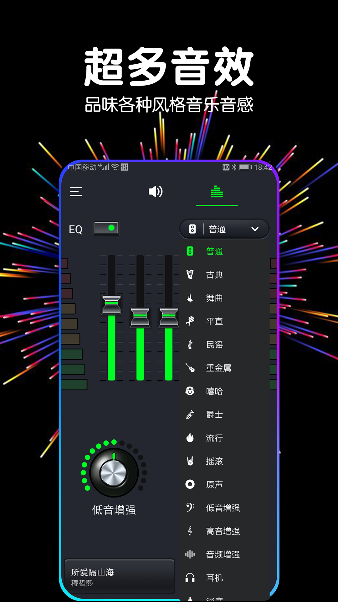 4、强大的音乐均衡器,具有20多种专业预设声音效果,五频段音乐均衡器,均衡器音量放大器