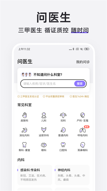 1、手机问医生,不用出门排队,手机就能问三甲医院好医生。