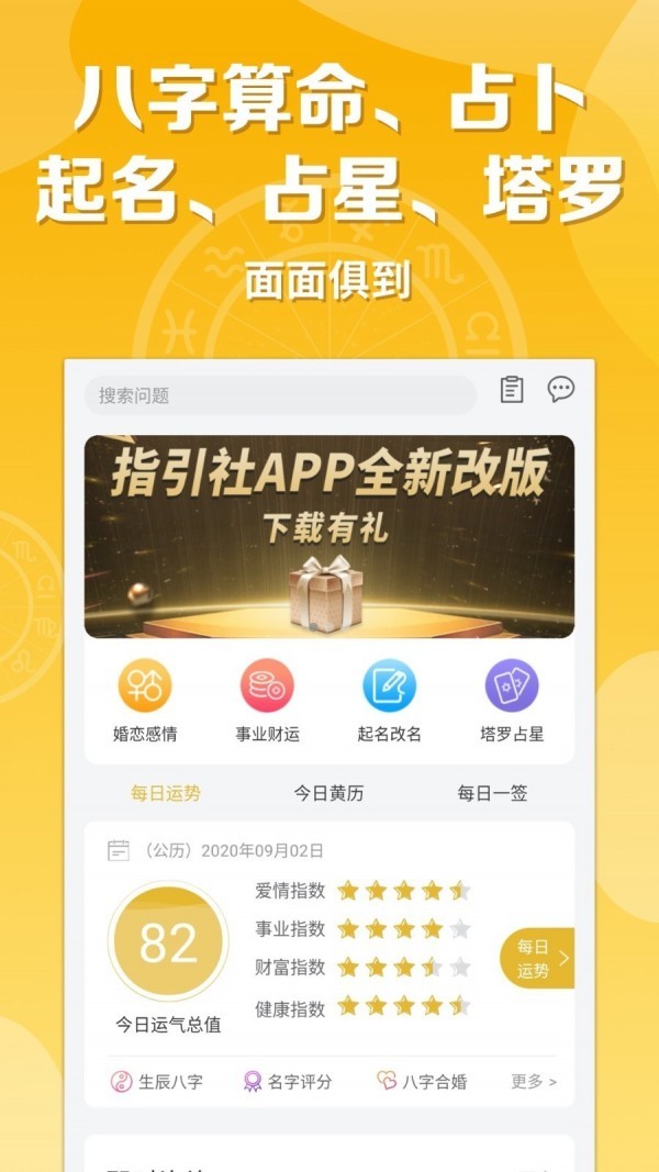 指引社app是一款手机算命软件, 该平台内容丰富,涉及多个领域,星座运势、感情婚姻、姓名分析、风水等,面面俱到,同时支持在线客服解答,公开课等特色内容,帮助广大用户做出更好的选择,也是一种对于美好的寄托,喜欢这款软件的小伙伴们快来下载体验吧!