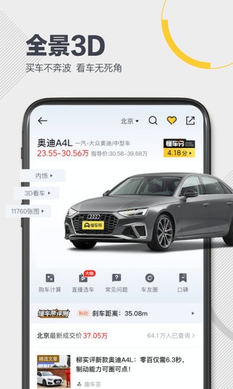 丰富的直播、小视频内容体验;创新的3d看车、拍照识车等丰富有趣的内容和功能,让你告别枯燥,开心选车。