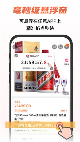 探潮抢茅台app是一款非常好用的抢酒软件,这款软件内汇聚了丰富的抢酒渠道,让你可以随时查看各个平台抢购信息,秒杀抢购,快捷省心,并且还不用自己守着购买,更有悬浮倒计时提醒,让大家直接点击操作更便捷,有需要的朋友快来下载体验吧。