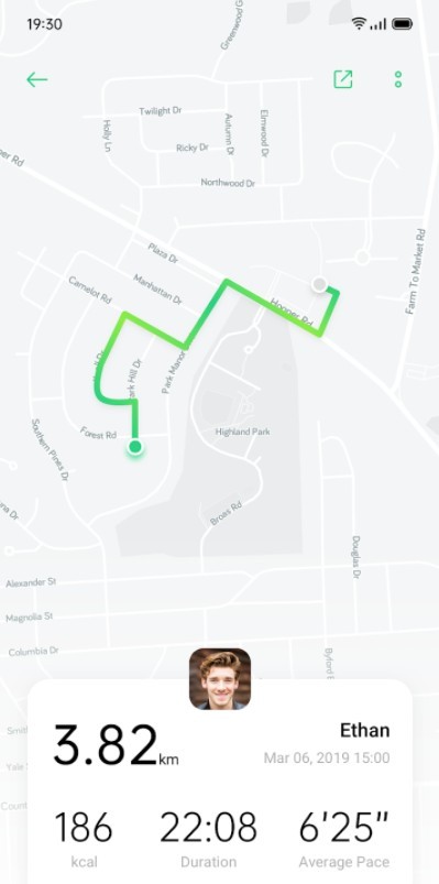 3、计步器:支持跑步、步行、骑行等多种运动类型,实时监测并记录行走步数、运动轨迹、配速、里程与卡路里等详细数据。