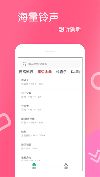免费铃声app是一款提供丰富铃声素材的手机软件,这里提供纯音乐、华语金曲、网络流行和DJ舞曲等多种不同风格的音乐。另一种方式需要你知道音乐或者歌手的名字,然后输入关键词来查找,输入后就会出现跟关键词相符合的列表,用户可轻松从这找到喜欢的铃声,并且都是免费,喜欢的朋友快来下载体验吧!
