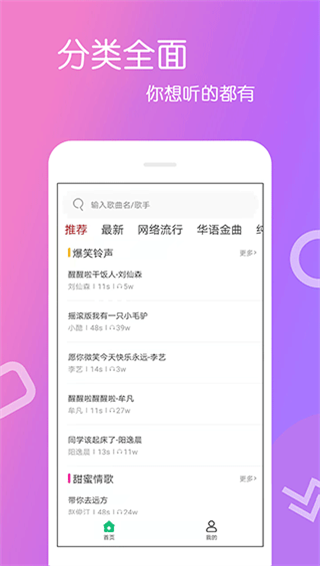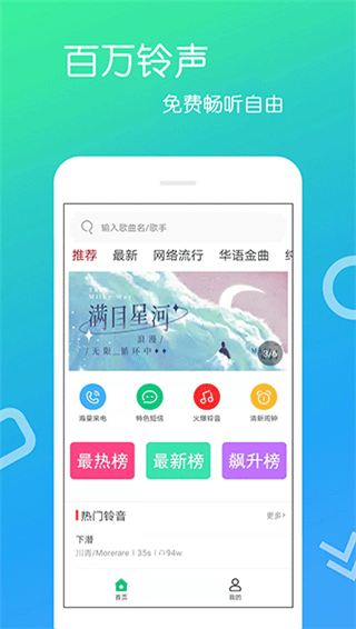 有网络流行、轻音乐、DJ、欧美日韩、时下热播剧、恶搞、摇滚等火热铃声,汇聚各大明星来电歌曲。