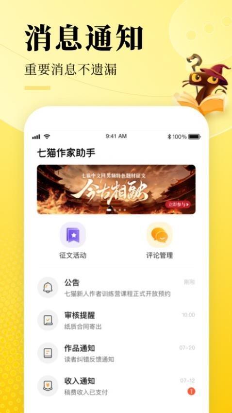 支持查看公告、审核提醒、作品通知、收入通知、征文活动等重要消息通知。