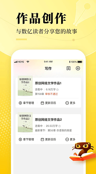 作品创作:支持创建作品,便捷发布、修改章节、保存草稿。