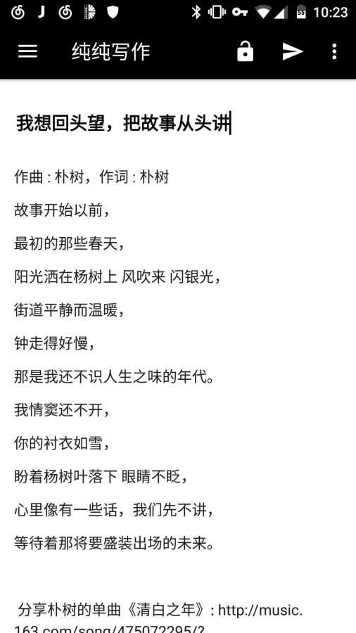 纯纯写作app是一款轻便实用的小清新文本编辑器,该软件体积小巧玲珑,界面简洁精美,运行稳定流畅,操作过程便捷高效,拥有文本编辑、键盘切换、云端保存、指纹加密、快速分享等一系列实用供功能,实际体验十分良好。