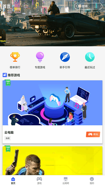 1、在本站下载安装并打开易点玩云游戏,进入软件首页,用户可以看到福利任务,活动中心,专题游戏等快捷入口。