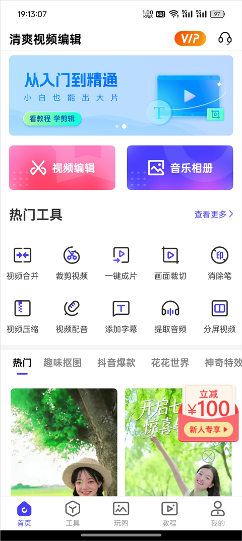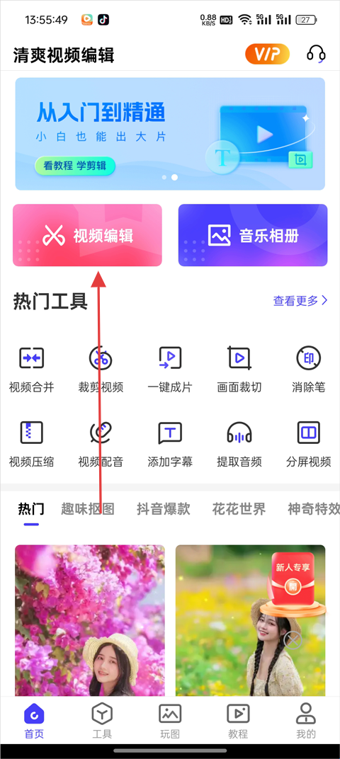 1、在首页点击选择热门工具中的【一键成片】功能;
