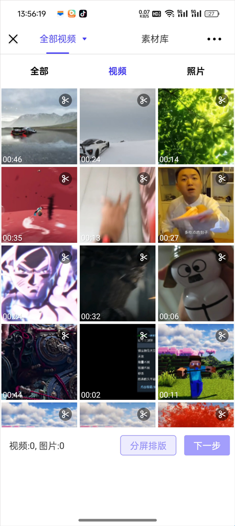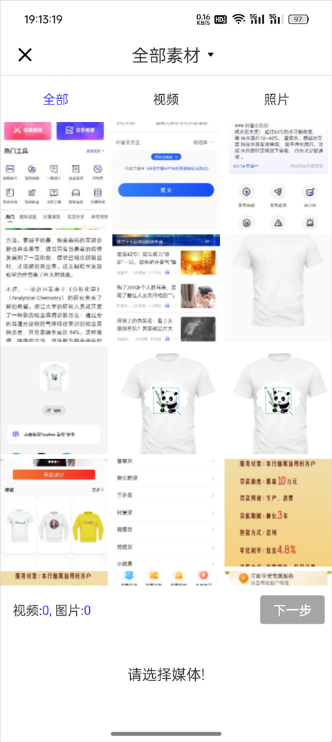 2、在手机相册中上传需要操作的视频文件、图片文件,点击右下角【下一步】按钮即可;