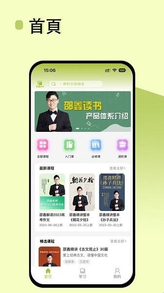 邵鑫读书是一款非常好用的阅读软件,这款软件内拥有海量的书籍,各类书籍资源这里都有,专门为喜欢看书的用户打造的,并且还将书籍缩成30分钟的音频视频文件。让你闭上眼睛也可以倾听精彩的内容,并且这里的书籍还会实时更新,沉浸式的听书体验,打造优美的课堂阅读氛围,喜欢看书的朋友快来下载体验吧。