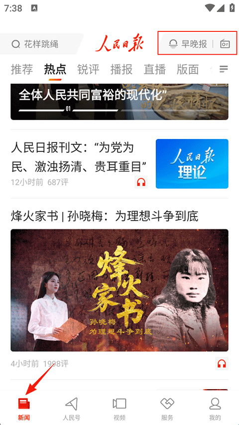 1、打开人民日报APP,点击新闻-右上角的早晚报。