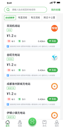 1、用户点开APP,即可在首页找到距离自己最近的电动车充电桩,并标注了各个充电桩的使用费用以及空闲充电桩供选择。同时,在个人用户一栏,还设置了充电桩报装通道,极大方便了电动汽车用户安桩需求。
