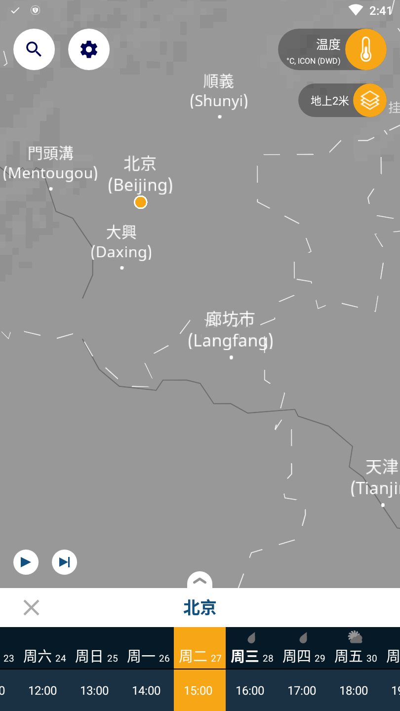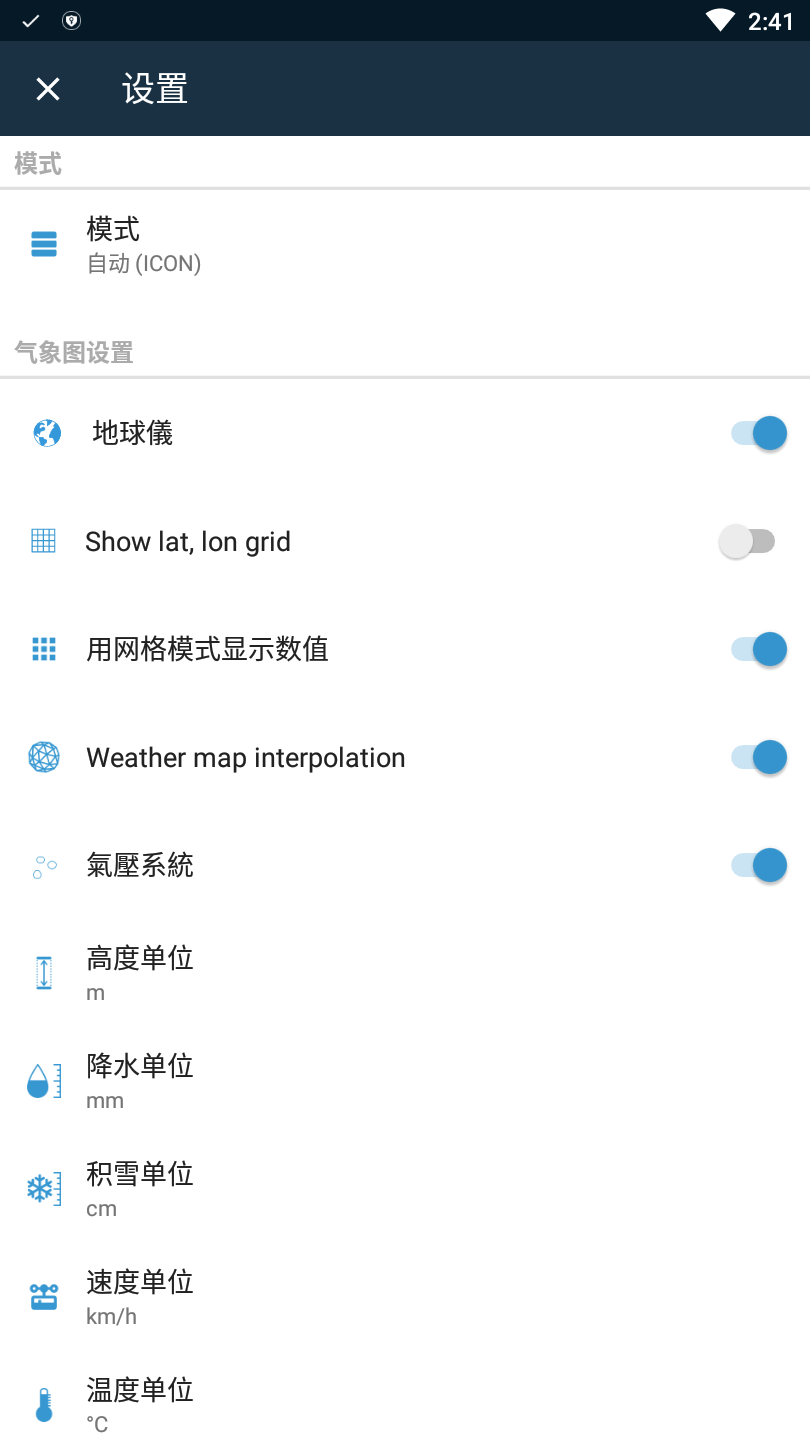 参考上面的降水量地图,点击左上角的设置齿轮图标,可以设置语言(如果默认不是简体中文界面,从此处设置),设置气压、气温、降水等气象数值单位。