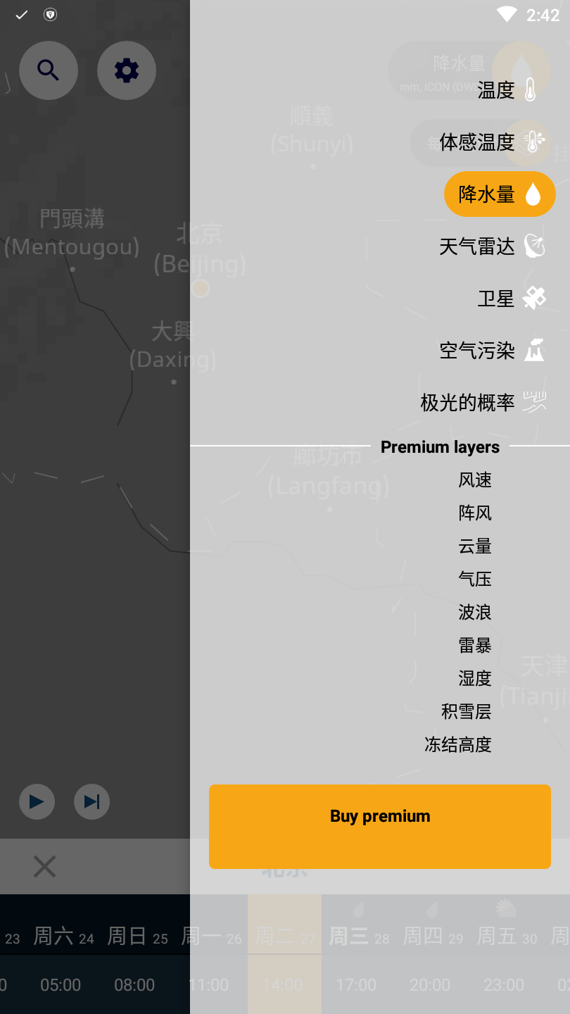 点击右上角的橙色圆形按钮,可在温度、体感温度、降水量、天气雷达、卫星云图、空气污染等气象指数之间切换。