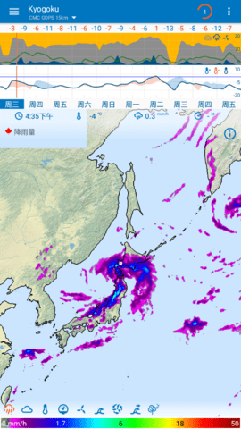 6、贴图:使用手指轻扫可控制随时间变化的预测动画。选择要显示在地图上的多个数据层,例如具有风流线的降水和云层。