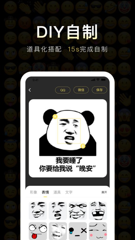4、表情制作:提供表情包、道具模板,最快15s就能定制表情包